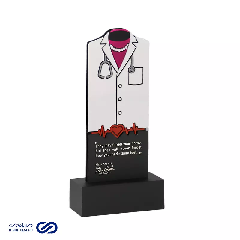 تندیس روپوش پزشکی زنانه طرح ۱ یک تندیس مفهومی و تخصصی در حوزه پزشکی است که با طراحی ظریف و حرفهای، نمادی از جایگاه و تلاش پزشکان و کادر درمان بانوان محسوب میشود. این تندیس از جنس پلکسی باکیفیت تولید شده و توسط مجموعه مانانشان به صورت آماده و سفارشی قابل ارائه است. امکان تغییر در ابعاد و جزئیات طراحی متناسب با نیاز سازمانها وجود دارد و این محصول گزینهای مناسب برای مراسم تقدیر، همایشهای پزشکی و هدایای سازمانی بوده و زمان معمول ساخت آن حدود ۷ روز کاری میباشد.