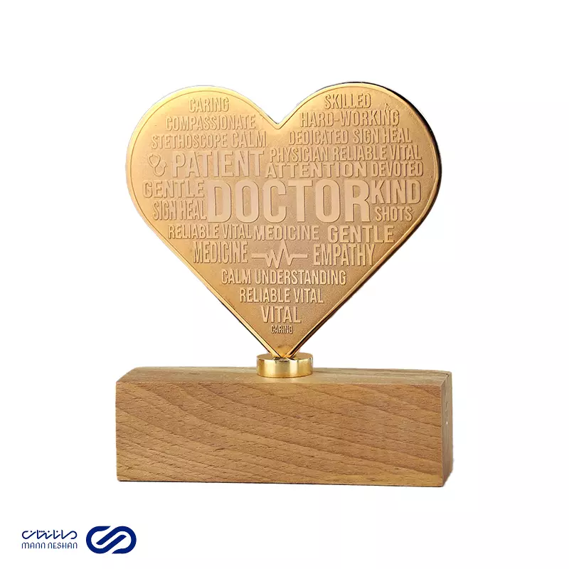 تندیس قلبی حکاکی شده پزشکی، یک تندیس مفهومی و تخصصی در حوزه پزشکی است که با طراحی رسمی و الهامگرفته از تایپوگرافی Doctor، نمادی از تعهد و جایگاه حرفهای کادر درمان محسوب میشود. این تندیس از جنس فلز و چوب راش باکیفیت تولید شده و توسط مجموعه مانانشان به صورت آماده و سفارشی قابل ارائه است. این محصول گزینهای مناسب برای مراسم تقدیر، همایش های پزشکی و هدایای سازمانی بوده و زمان معمول ساخت آن حدود 14 روز کاری میباشد.